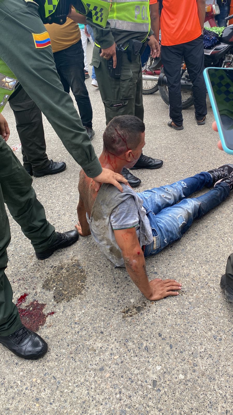 Los hechos ocurrieron en la intersección de la calle 39 con carrera 5ta, cuando dos sujetos a bordo de una motocicleta interceptaron a un ciudadano, amenazándolo con un arma de fuego y despojándolo de una cadena de valor. Durante su huida el delincuente acciona el arma impactando a su conductor de la moto. Ante esta situación, el acompañante del delincuente herido apuntó con su arma a otro motociclista, obligándolo a partir del lugar.