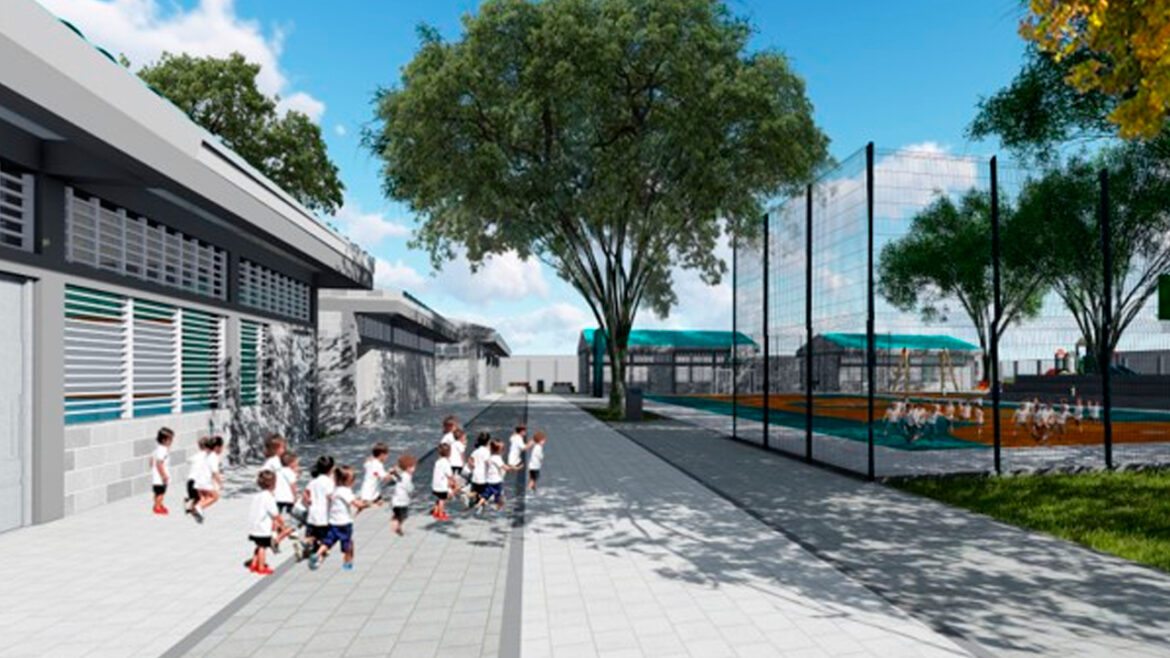 Dentro de la propuesta arquitectónica se dispusieron construir 3 bloques de 2 aulas cada uno, batería sanitaria de niños, niñas y personas de movilidad reducida, así como cuartos técnicos, cocina y comedor estudiantil, cuarto de basuras, cancha polideportiva, zona de juegos y graderías.