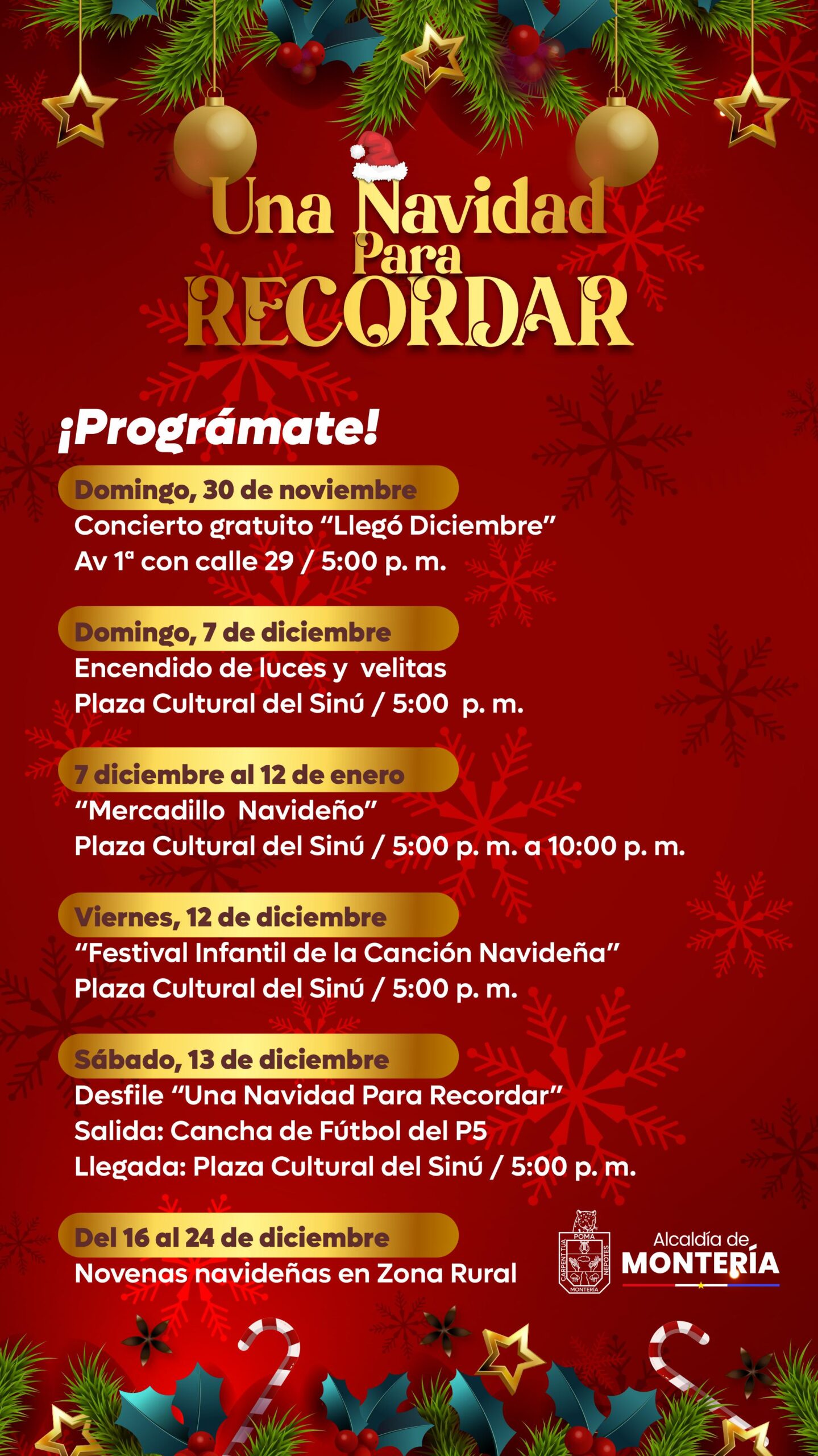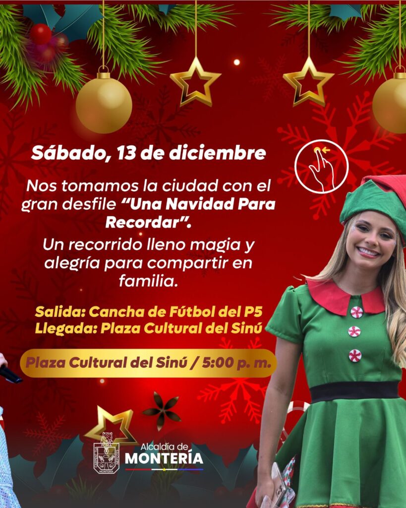 El espíritu navideño se tomará las calles el sábado 13 de diciembre con el gran desfile “Una Navidad Para Recordar”, que partirá desde la Cancha de Fútbol del P5 y llegará a la Plaza Cultural del Sinú, llevando magia y color a toda la ciudad.