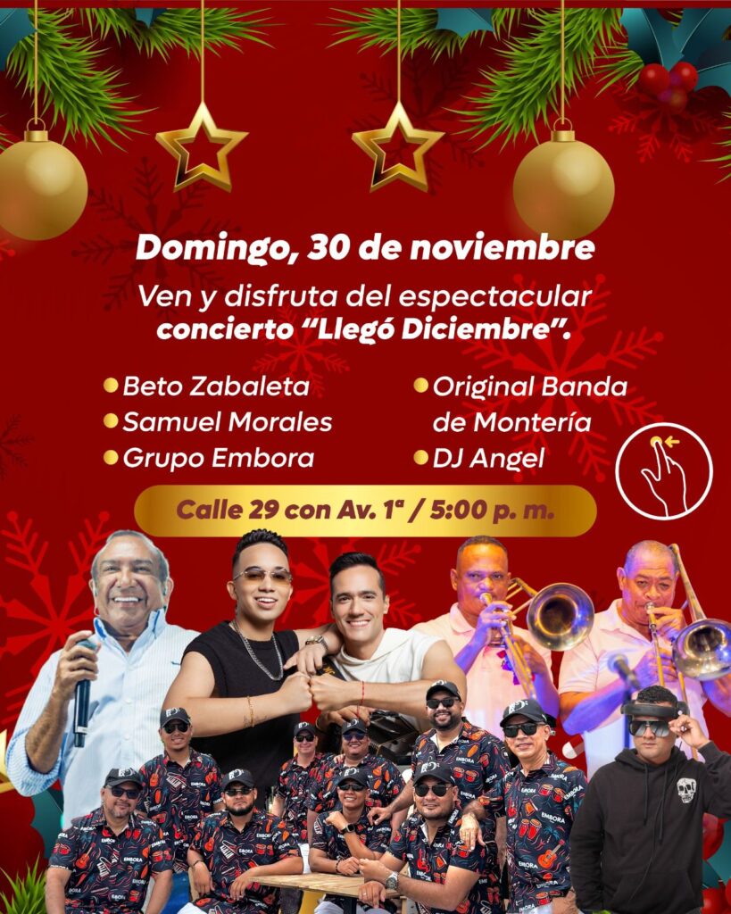 La celebración inicia el domingo 30 de noviembre con el concierto gratuito “Llegó Diciembre”, un evento que reunirá en un mismo escenario a Beto Zabaleta, Samuel Morales, Grupo Embora, la Original Banda de Montería y DJ Ángel. El espectáculo tendrá lugar en la calle 29 con Av. 1ª, desde las 5:00 p. m.