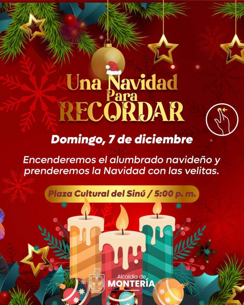 El 7 de diciembre, Montería encenderá oficialmente su alumbrado navideño y celebrará la noche de las velitas en la Plaza Cultural del Sinú, también desde las 5:00 p. m., en un encuentro que promete iluminar los corazones de miles de familias.