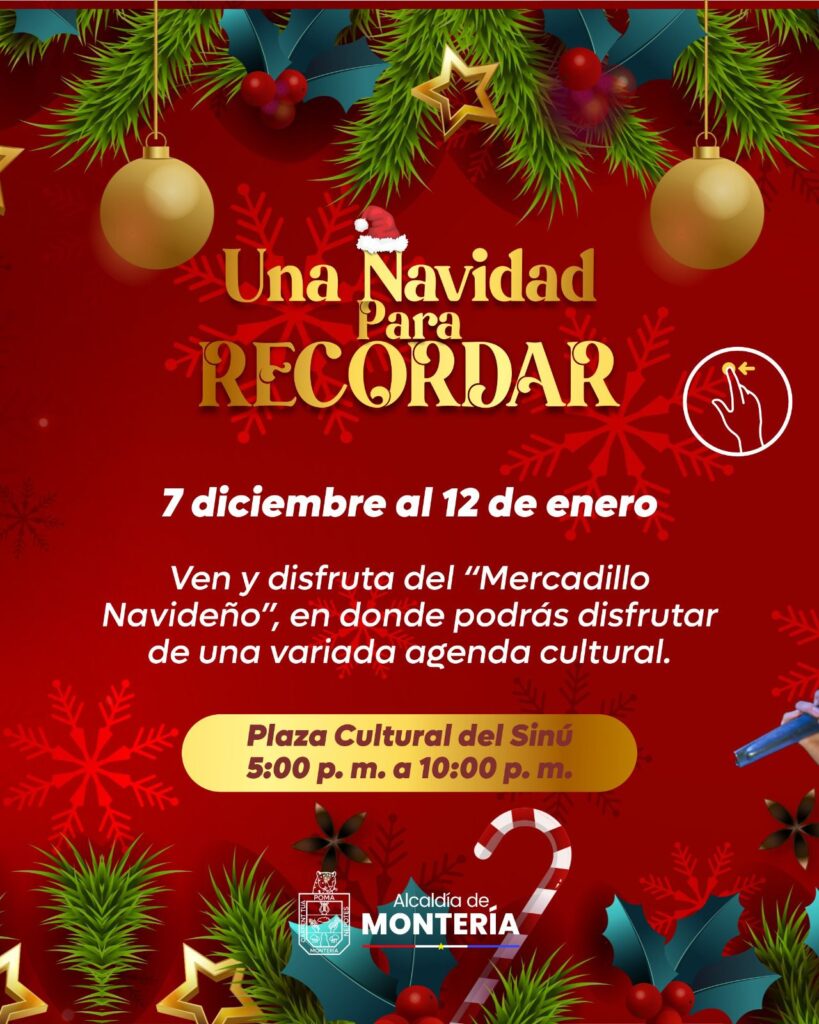 Desde el 7 de diciembre hasta el 12 de enero, los monterianos y visitantes podrán disfrutar del tradicional Mercadillo Navideño, un espacio lleno de emprendimientos, gastronomía y una variada agenda cultural, abierto de 5:00 p. m. a 10:00 p. m. en la Plaza Cultural del Sinú.