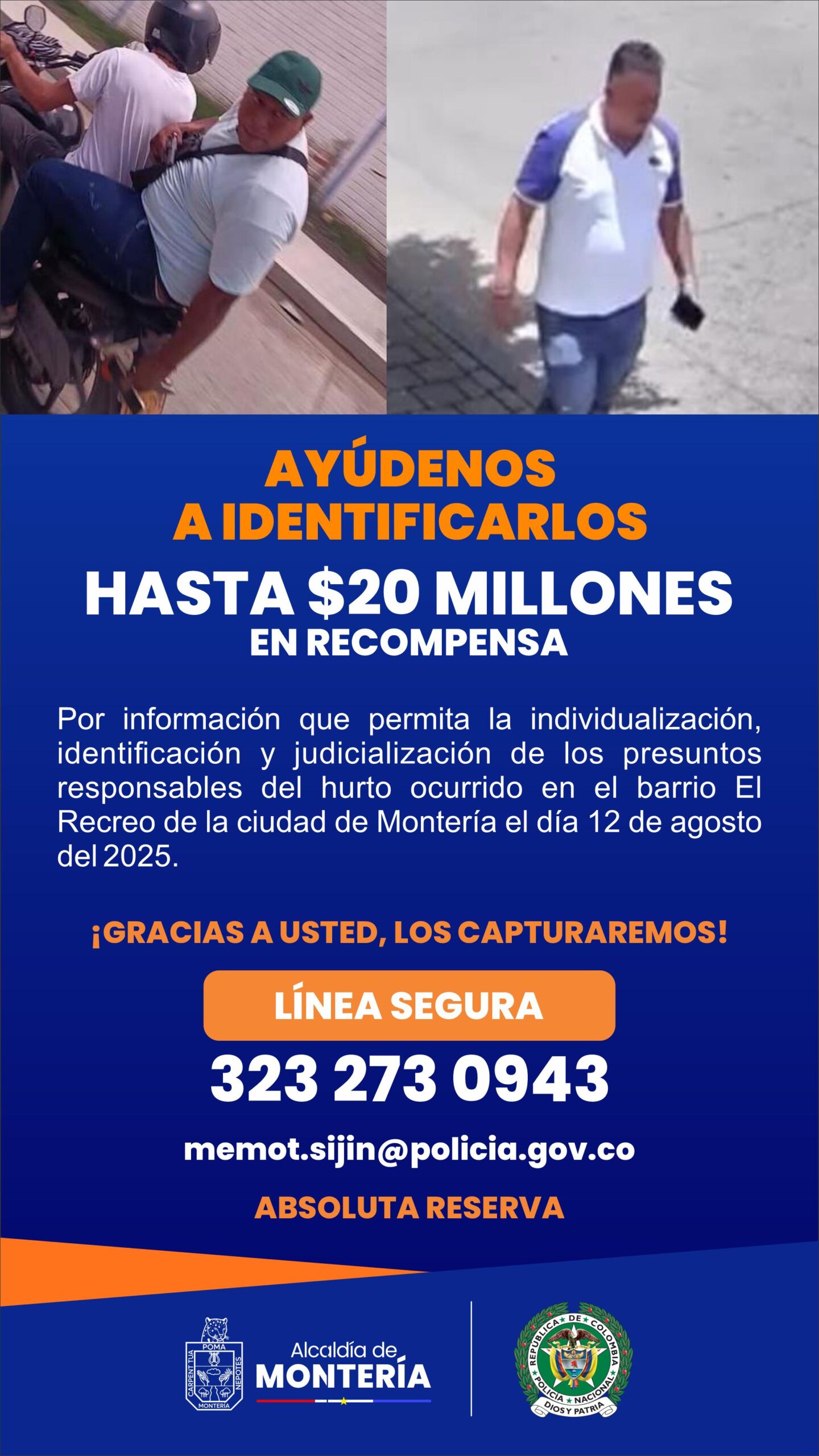 Montería, 13 de agosto de 2025. La Alcaldía de Montería y la Policía Metropolitana anunciaron que otorgarán una recompensa de hasta $20.000.000 a quien suministre información veraz y oportuna que permita la identificación e individualización de los delincuentes responsables de los hurtos cometidos contra usuarios del sistema financiero a través de la modalidad delictiva del “Fleteo” los pasados 8 y 12 de agosto. Bandidos que quedaron grabados por cámaras de seguridad.