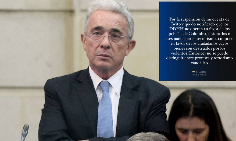 El expresidente de Colombia Álvaro Uribe se pronunció luego de que la red social Twitter tomará la decisión de bloquearle un tuit en el que se refería a apoyar el derecho de los policías y soldados de utilizar sus armas ante los actos vandálicos para defender su integridad y a la comunidad.