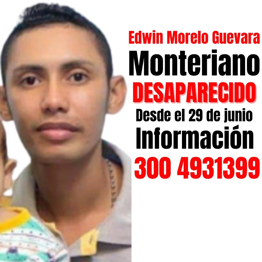 Se trata de Edwin Morelo Guevara, quien se encuentra desaparecido desde el pasado 29 de junio. Según sus familiares el joven de profesión electricista, salió a trabajar desde su residencia ubicada en Montería con destino a un pueblo y hasta la fecha no saben de su paradero.