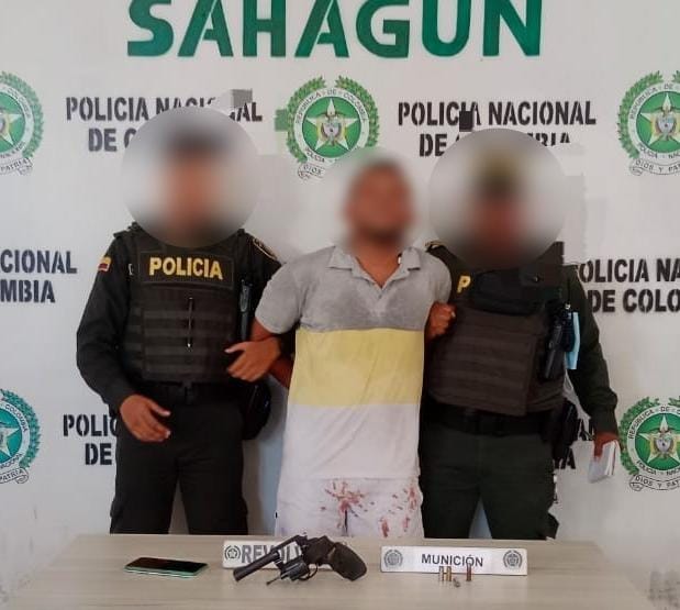 Alias “El Loro”, fue sorprendido por los uniformados en la vereda La Culebra del municipio de Sahagún, portando de manera ilegal un arma de fuego tipo revólver calibre 38mm, con cañón reforzado y munición para la misma. Tendría tres cartuchos percutados.