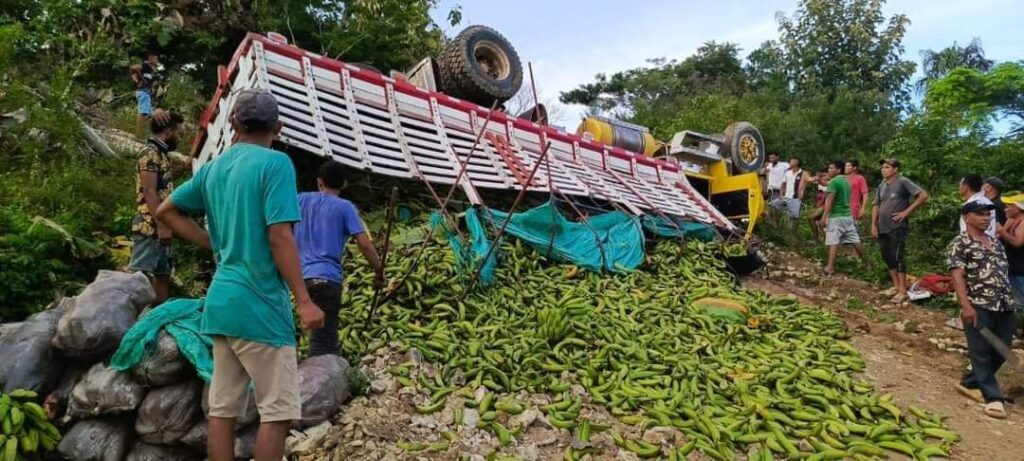 Un camión repleto de plátanos se volcó en la vereda Juantaut, corregimiento de Si se van, en Canalete, Córdoba, debido al deplorable estado de la vía rural. El vehículo perdió estabilidad mientras transitaba por uno de los tramos más dañados, lo que provocó el accidente este sabado 21 de septiembre.