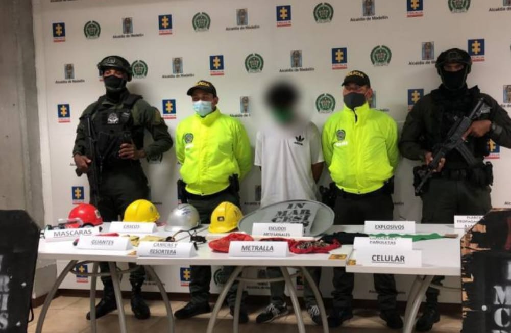 Entre los capturados se encuentra alias `Carro Loco´, quien fue detenido en Medellín y a quien la Policía señala de ser el líder del grupo organizado `Primera Línea Norte´ y al que le fueron encontrados elementos para la fabricación de explosivos artesanales y bombas molotov, además de elementos de intendencia tales como cascos industriales, máscaras antigás y escudos de fabricación artesanal.
