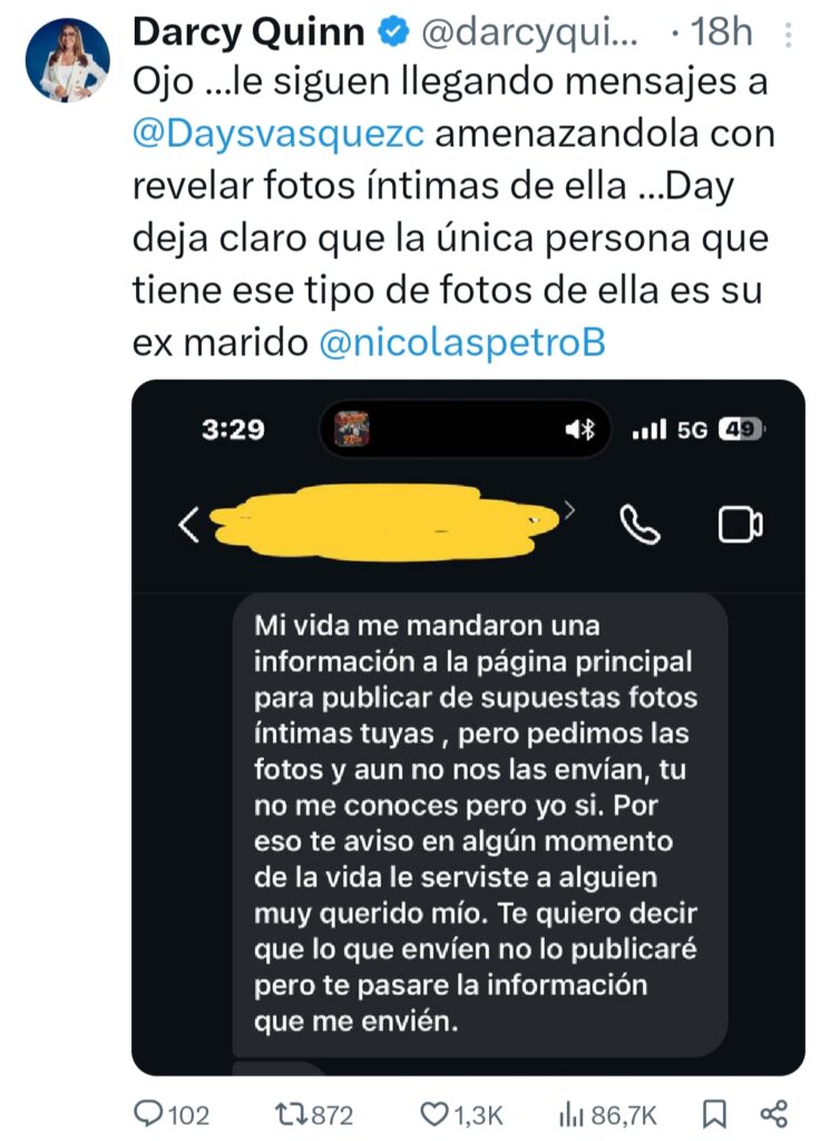 La integridad de Day Vásquez volvió a quedar en el centro del huracán, esta vez para un mensaje anónimo que advierte sobre la posible circulación de fotografías privadas suyas.