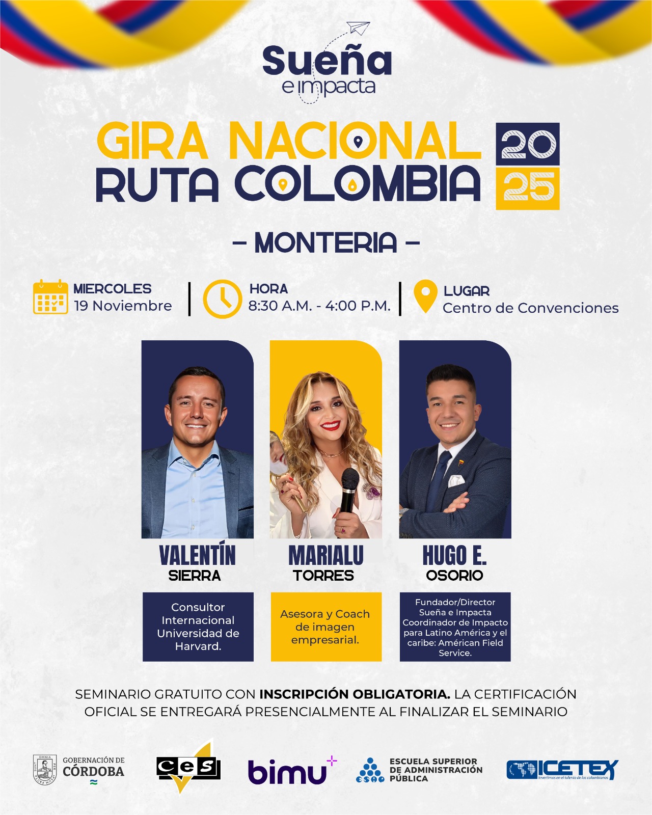 Montería, 13 de noviembre de 2025. La Gobernación de Córdoba, en alianza con la Fundación Sueña e Impacta, continúa fortaleciendo los procesos de liderazgo juvenil en el departamento con la realización de la Gira Nacional 2025, que llegará a Montería el 19 de noviembre con el seminario “Liderazgo Juvenil de Alto Impacto Social”.