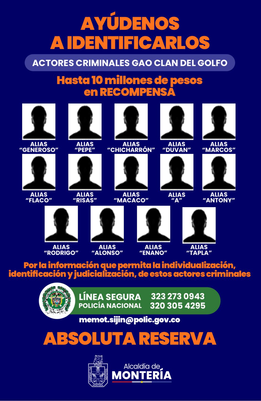 El secretario de Gobierno, Carlos García Suárez, indicó: “Ofrecemos hasta 10 millones de pesos por la identificación de los alias integrantes del Clan del Golfo que aparecen en el cartel de las siluetas».