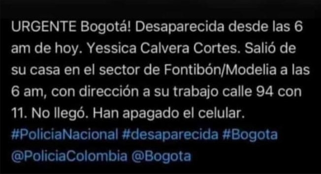Luego de completar más de 12 horas desaparecidas una mujer de 39 años identificada como Yéssica Calvera Cortés fue hallada sin vida en su apartamento, ubicado en el barrio Modelia, de la localidad de Fontibón.