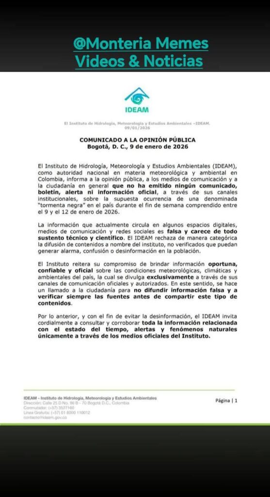 El Instituto de Hidrología, Meteorología y Estudios Ambientales (IDEAM) desmintió este jueves la circulación de información falsa relacionada con una supuesta “tormenta negra” que, según mensajes difundidos en redes sociales, afectaría al país durante el fin de semana comprendido entre el 9 y el 12 de enero de 2026.