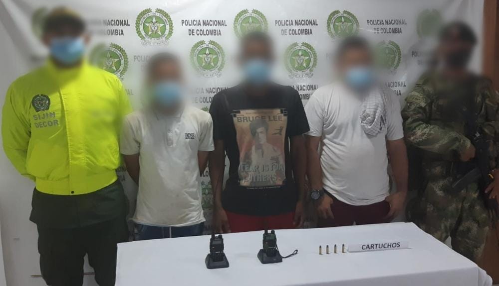 La acción policial se llevó a cabo en la vereda Bocas de Cristalina, zona rural del municipio de Puerto Libertador, allí, los uniformados lograron sorprender a los sujetos con dos radios de comunicación y cuatro cartuchos calibre 38 milímetros. Se dieron a la huida pero fueron capturados a poco metros del lugar.