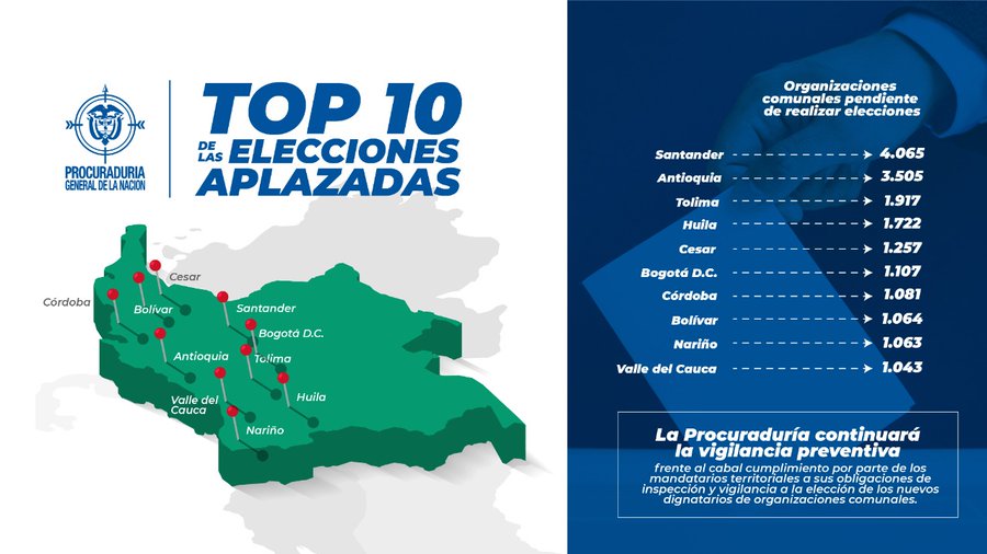 Luego del reporte enviado por el Ministerio del Interior con el consolidado de la elección para JAC 2021, se evidenció que los departamentos de Santander (4065), Antioquia (3505), Tolima (1917), Huila (1722), Cesar (1257) y Córdoba (1.081) encabezan el ‘top 10 de las elecciones aplazadas’, teniendo como principales causas: no integrar el Tribunal de Garantías, problemas de carácter documental, oposición de la comunidad y contingencias presentadas por la época invernal.