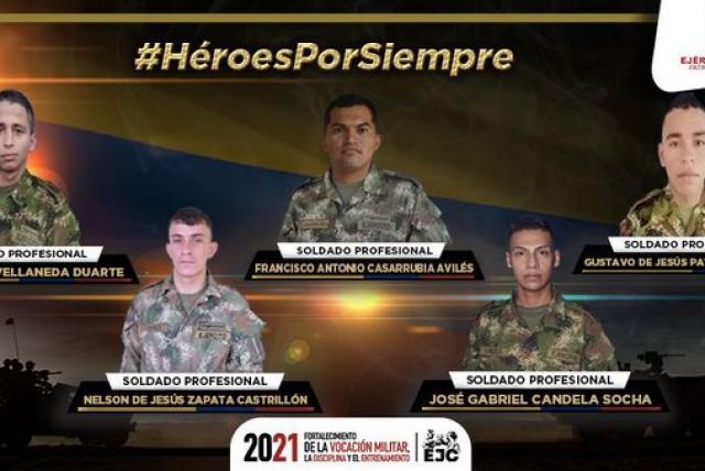 Con relación a los soldados asesinados indicó que fueron identificados como Eduardo Avellaneda Duarte, Francisco Casarrubia Avilez, José Candela Socha, Gustavo Paternina Moreno y Nelson Zapata Castrillón, mientras que los heridos fueron trasladados a las unidades de cuidados intensivos de las clínicas Casa del Niño, Central e Imat y todos se encuentran en grave estado de salud.