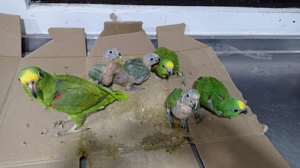 Durante los registros a personas y vehículos, los uniformados encontraron a un sujeto que trasportaba en morrales y cajas de cartón seis loros moña amarilla, una cheja (guacamaya severa), cuatro pericos, seis cotorras, dos martejas, dos ardillas, un oso perezoso y un tigrillo, los cuales al parecer iban a ser comercializados.
