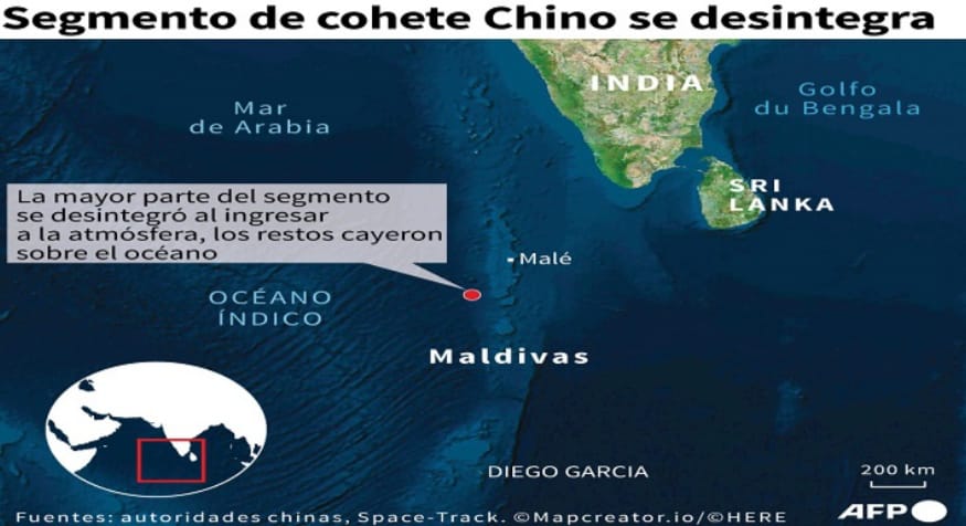 «Según la supervisión y el análisis, a las 10:24 a.m., del 9 de mayo de 2021 la primera etapa del cohete portador Larga Marcha 5B ha vuelto a entrar en la atmósfera», informó la Agencia Espacial de vuelos tripulados de China en un comunicado, proporcionando las coordenadas de un punto situado en el Océano Índico cerca de las Maldivas.