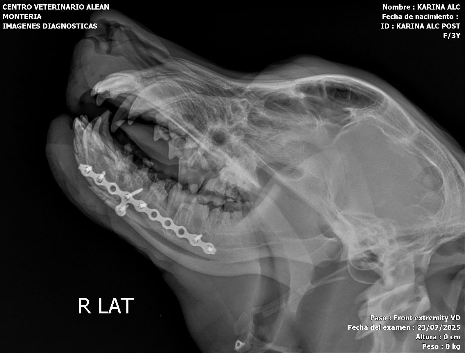 Hoy fue sometida a una tercera cirugía en la mandíbula, en la que se realizó una reconstrucción completa y una reducción total del radio. Además, se le colocó un sustituto óseo a base de silicofosfatos de sodio-calcio en el radio y la ulna.