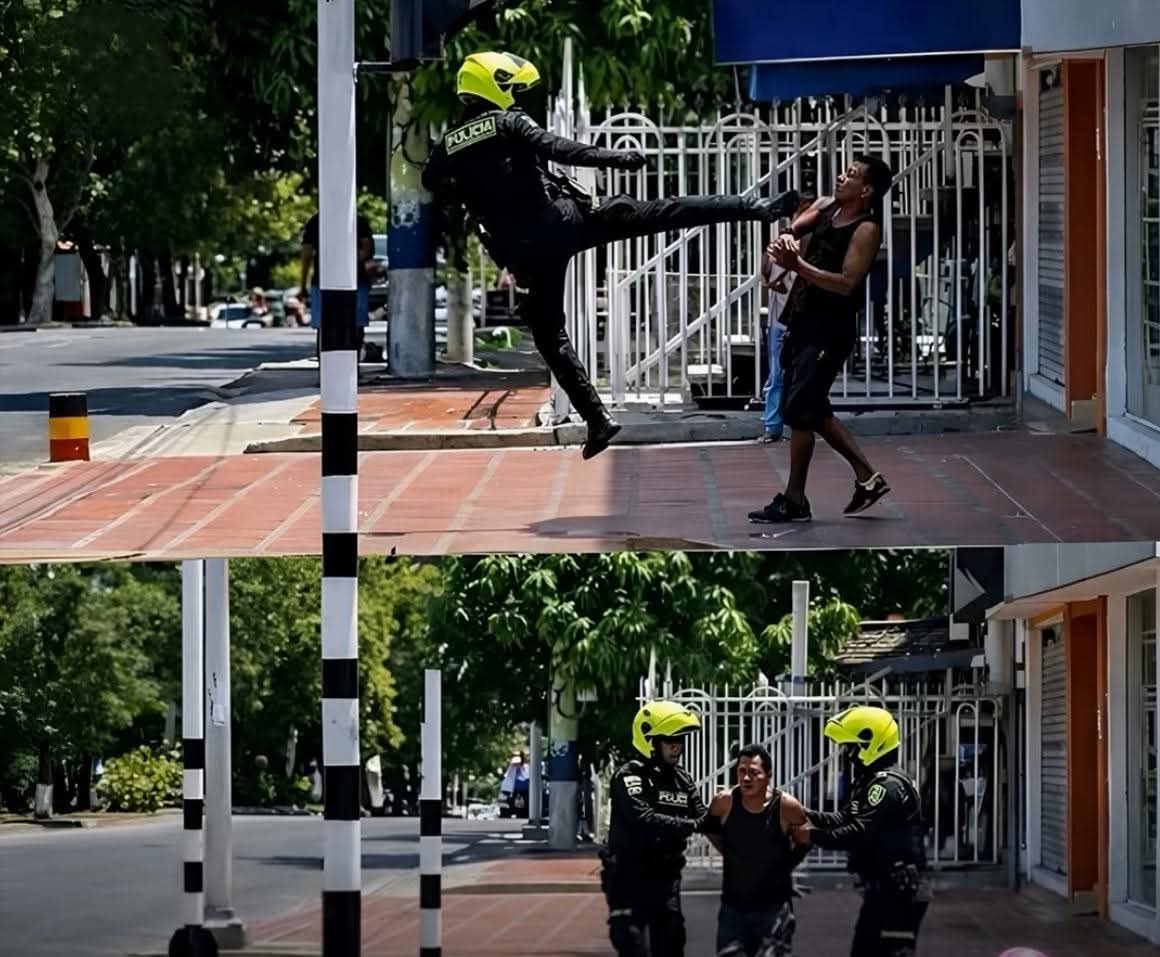 Lo que nadie esperaba era la forma en que uno de los policías logró reducirlo. En medio del procedimiento, el uniformado tomó impulso y lanzó una patada voladora que dejó al sujeto sin posibilidad de reaccionar, permitiendo inmovilizarlo en cuestión de segundos.
