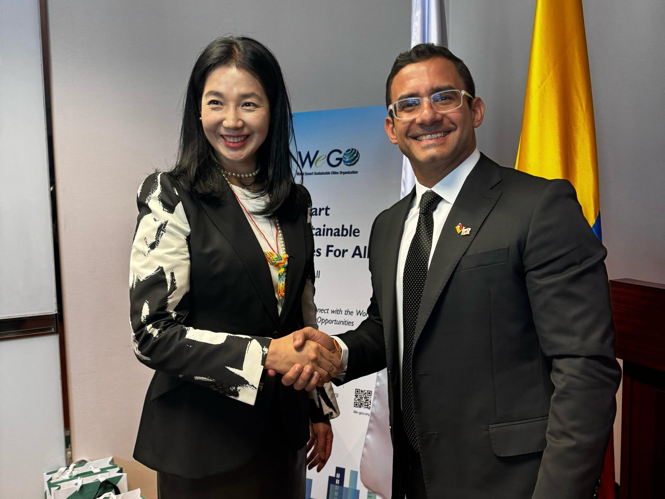 Seúl, Corea del Sur, 26 de febrero de 2024. El alcalde de Montería, Hugo Kerguelén García, en su primer día de trabajo en la Misión a Corea, sostuvo un importante diálogo con Jung Sook Park, secretaria General de WeGO, empresa que funciona bajo la sombrilla del gobierno Coreano para el manejo de temas de ciudades inteligentes.