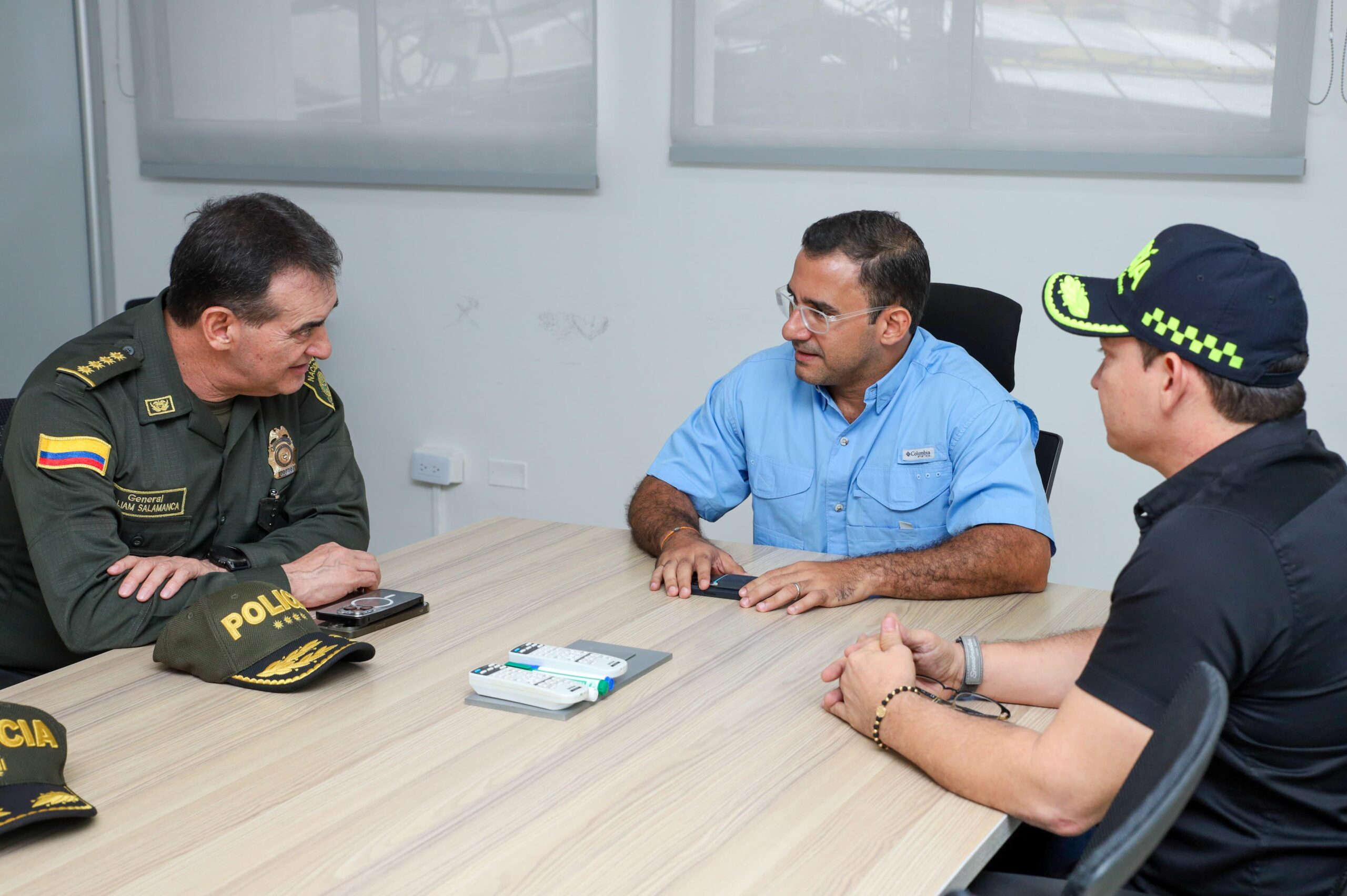Montería, 20 de marzo de 2024. El alcalde de Montería, Hugo Kerguelén García, se reunió con el director General de la Policía, general William Salamanca Ramírez, con el propósito de fortalecer la hoja de ruta conjunta que se adelanta entre la administración municipal y la Policía Metropolitana de Montería para contrarrestar el delito y el accionar de los grupos de crimen organizado.