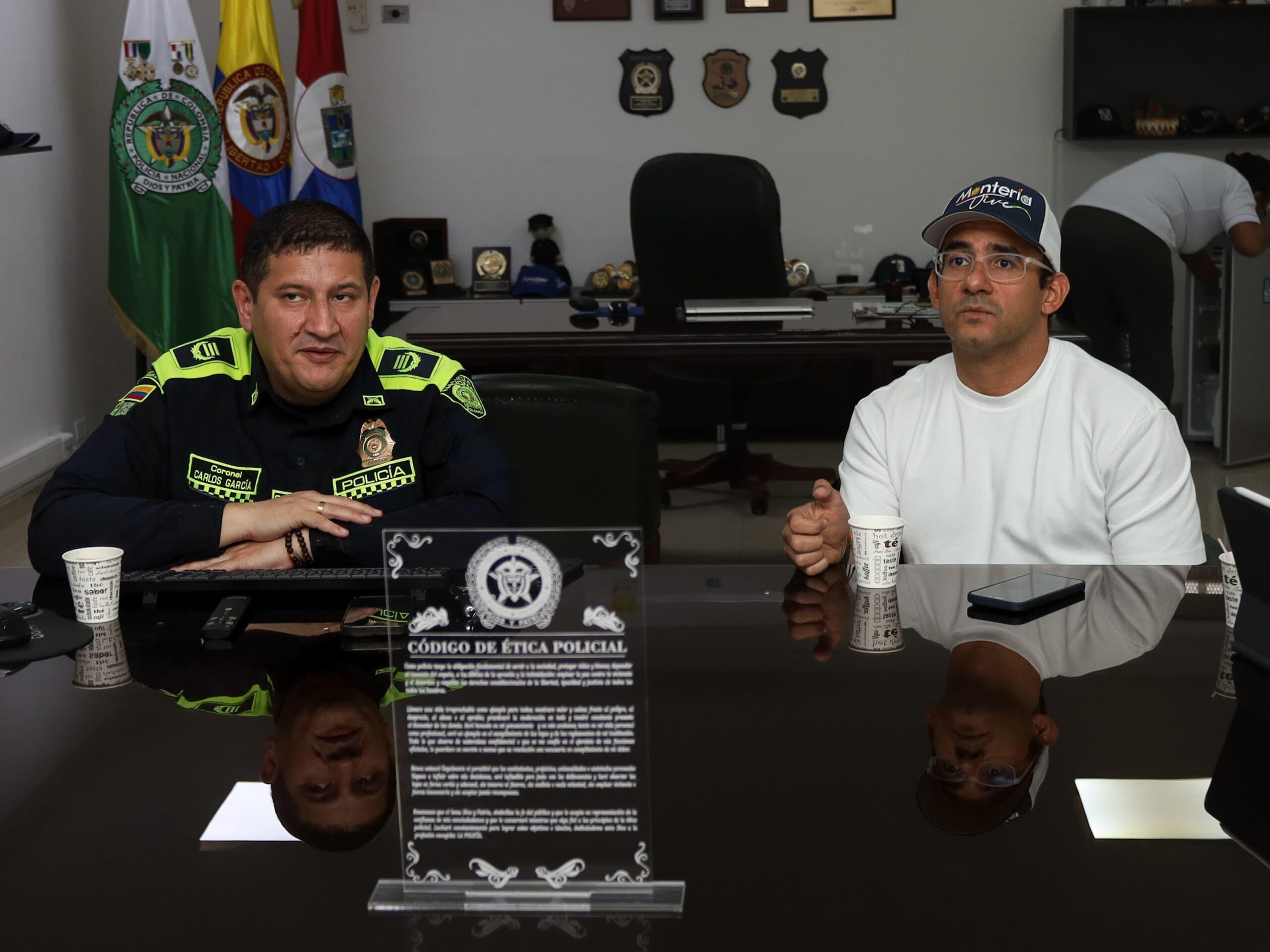 Montería, 28 de junio de 2024. El alcalde de Montería, Hugo Kerguelén García, y el comandante de la Policía Metropolitana de Montería, coronel Carlos García Suárez, se reunieron con el ánimo de hacerle seguimiento al decálogo de acciones que se vienen implementando desde el mes de enero y reforzar las estrategias en barrios y corregimientos.