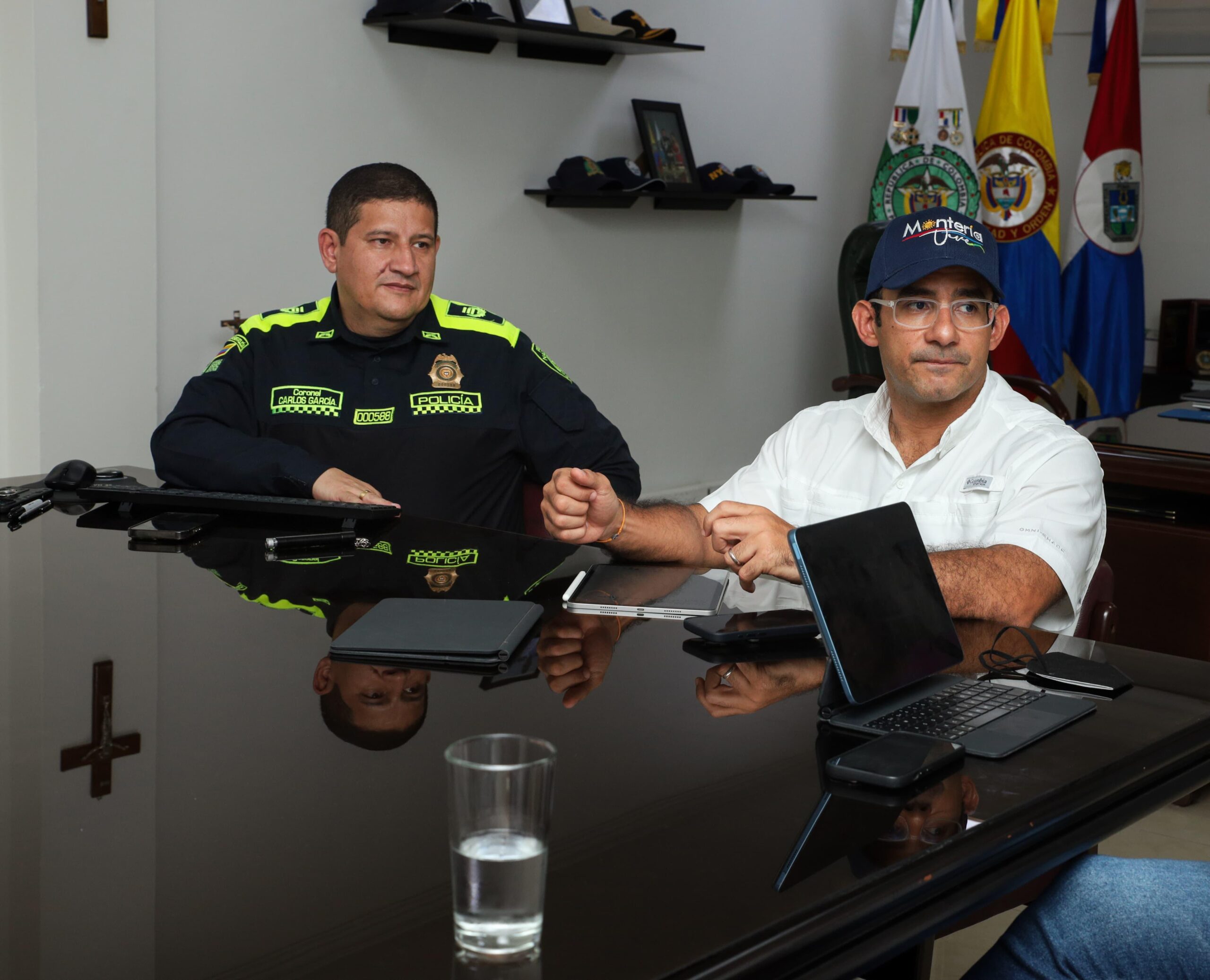 Montería, 18 de abril de 2024. Con el propósito de analizar los resultados de las acciones operativas desplegadas en la Comuna 6, se reunieron el alcalde de Montería, Hugo Kerguelén García, y el comandante de la Policía Metropolitana de Montería, coronel Carlos García.