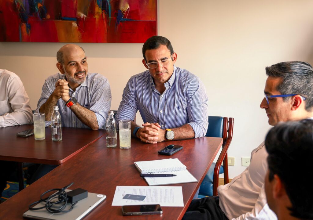 Cali, 25 de octubre de 2024. En el marco de la COP 16, el alcalde de Montería, Hugo Kerguelén García, junto al Gerente de Ciudad, Edgardo Espitia Cabrales, y el secretario de Planeación, Jhon Nel Rodríguez, mantuvieron una reunión con Rodrigo Peñailillo, representante del Banco de Desarrollo de América Latina y El Caribe (CAF) en Colombia.