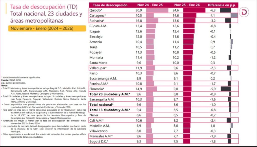 Montería, 27 de febrero de 2026. El alcalde de Montería, Hugo Kerguelén García, dio a conocer las cifras, del Departamento Administrativo Nacional de Estadística, DANE, relacionadas con el mercado laboral correspondientes al trimestre móvil noviembre 2025 – enero 2026, que evidencian avances importantes para Montería.