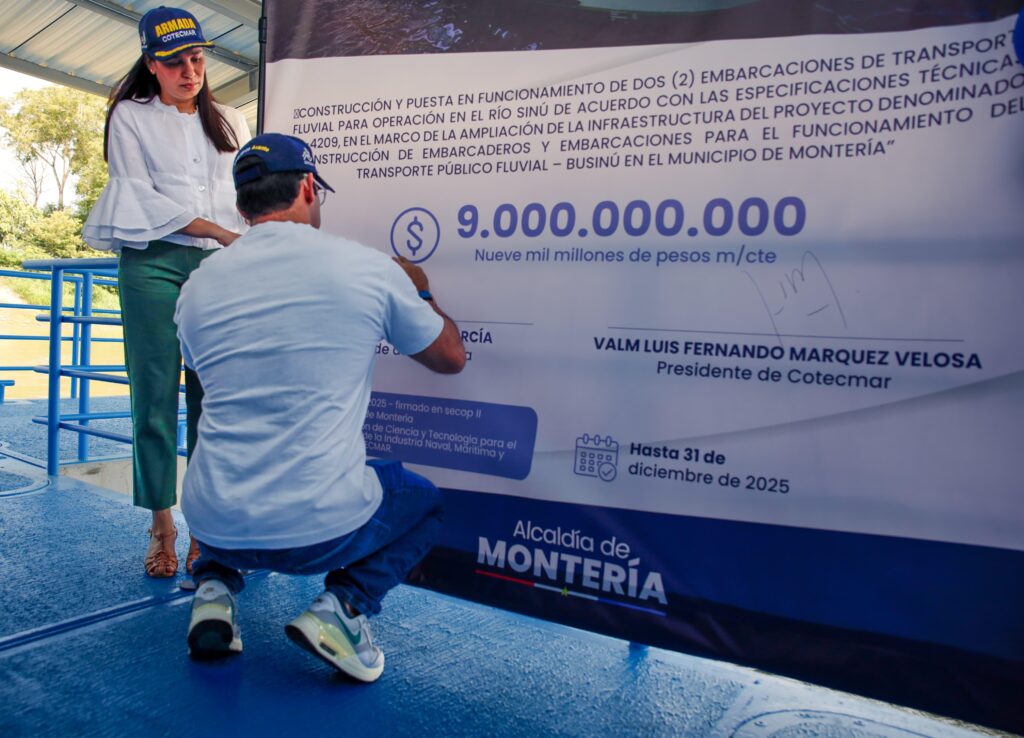 Montería, 16 de enero de 2025. La Alcaldía de Montería continúa dando pasos seguros hacia la consolidación del proyecto Businú. Es así como este jueves, 16 de enero, recibió por parte de la firma constructora tres embarcaderos sobre el río Sinú, que se utilizarán en este sistema de transporte público fluvial. Además, firmó el contrato para la construcción de las dos primeras embarcaciones con Cotecmar.