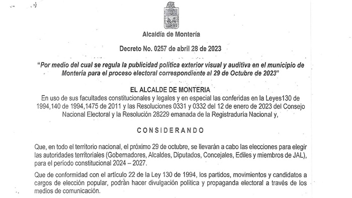 Montería, 18 de agosto de 2023. El Decreto 0257 de 2023 mediante el que se regula la publicidad política exterior visual y auditiva en el municipio se encuentra vigente y desde la administración municipal se conmina a acatar sus disposiciones, encaminadas a garantizar la transparencia y los derechos de los partidos y movimientos políticos, así como los grupos significativos de ciudadanos y movimientos sociales.