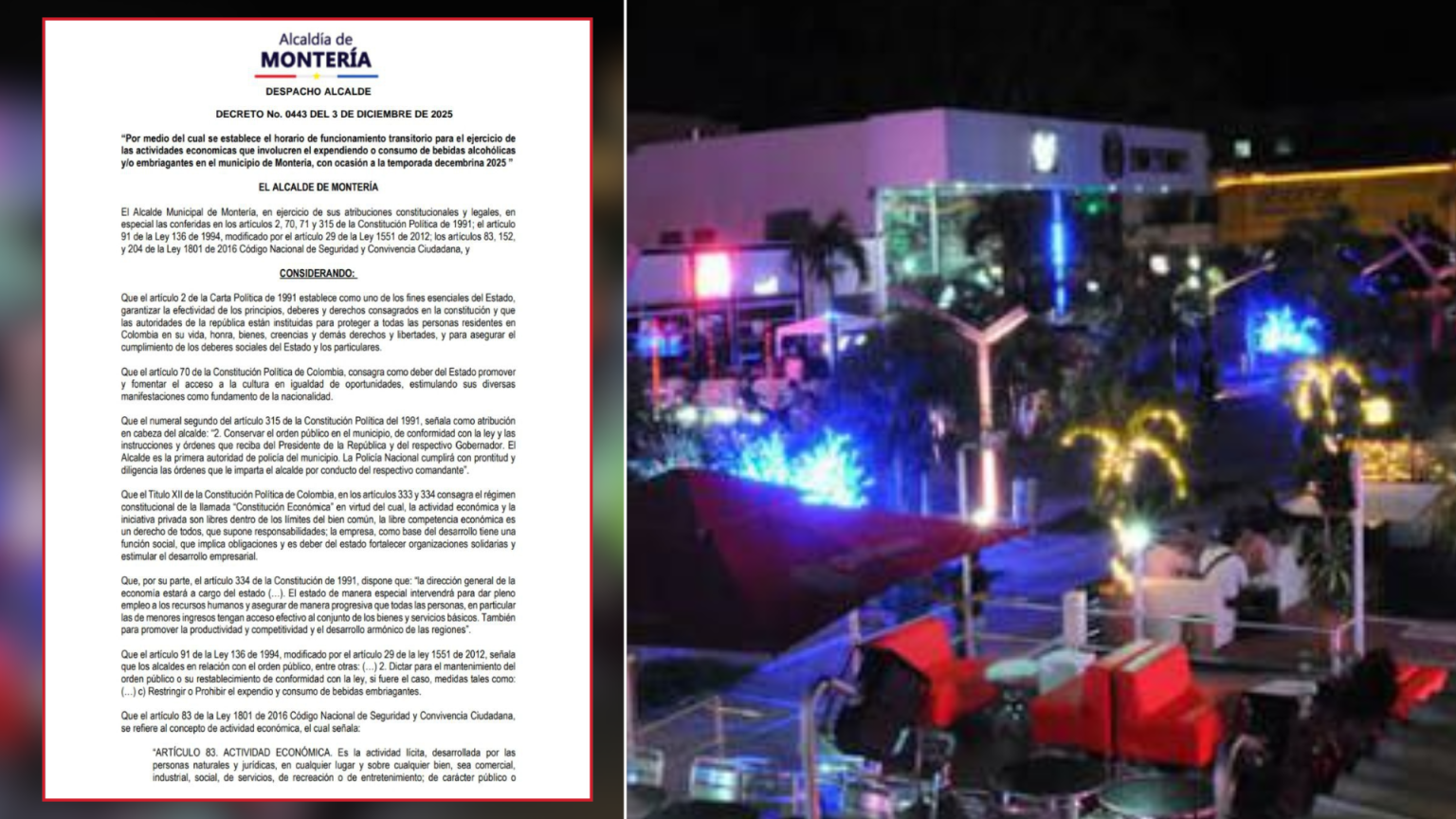 Montería, 7 diciembre de 2025. La Alcaldía de Montería informó a la ciudadanía y al sector comercial la expedición del Decreto 443 del 3 de diciembre de 2025, por medio del cual se fijan los horarios transitorios de funcionamiento para los establecimientos que expenden o permiten el consumo de bebidas alcohólicas durante la temporada decembrina y de Año Nuevo.