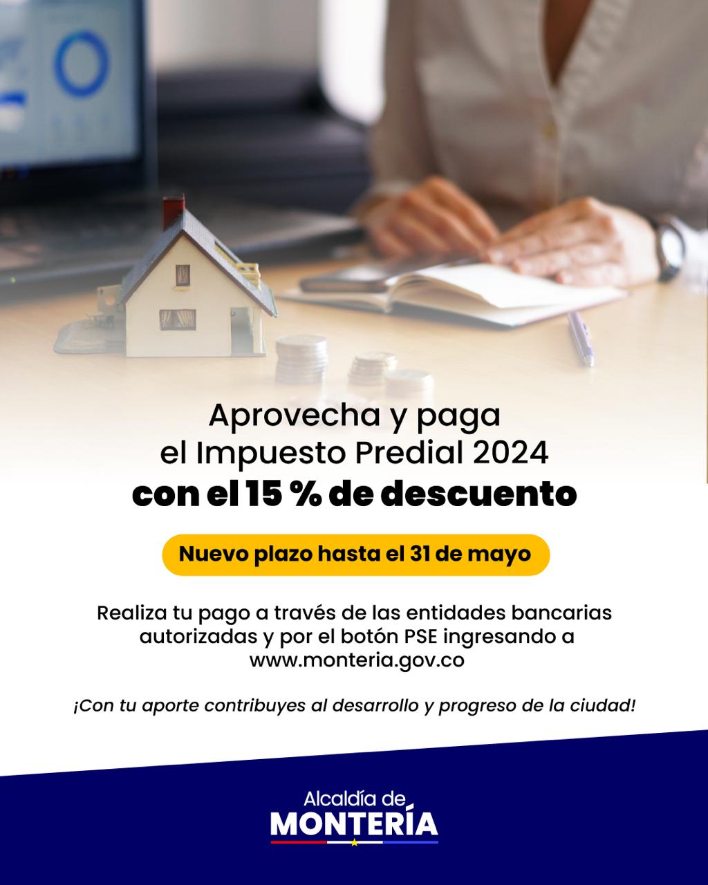 Montería, 4 de mayo de 2024. Desde hoy y hasta el 31 de mayo la Alcaldía de Montería extendió el plazo para que los contribuyentes aprovechen el 15% de descuento, por pronto pago, en el impuesto Predial Unificado de la vigencia 2024.