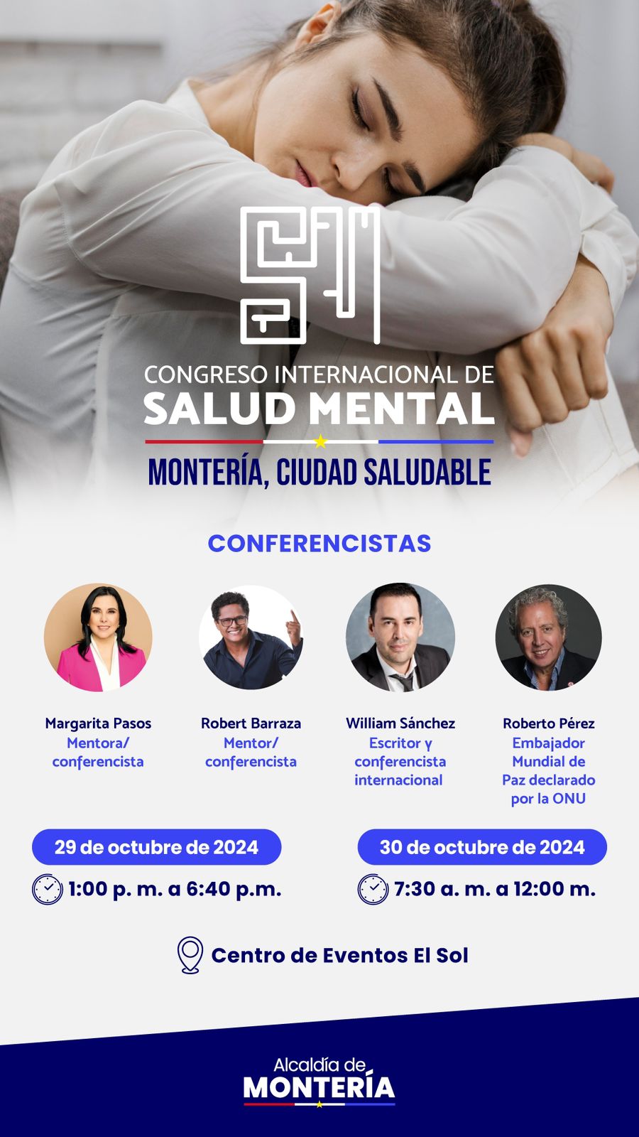 Montería, 26 de octubre de 2024. La Alcaldía de Montería realizará, durante el martes y el miércoles próximos, el Congreso Internacional de Salud Mental ‘Montería ciudad saludable’, certamen abierto a todo tipo de público, que tendrá como sede el Centro de eventos El Sol.