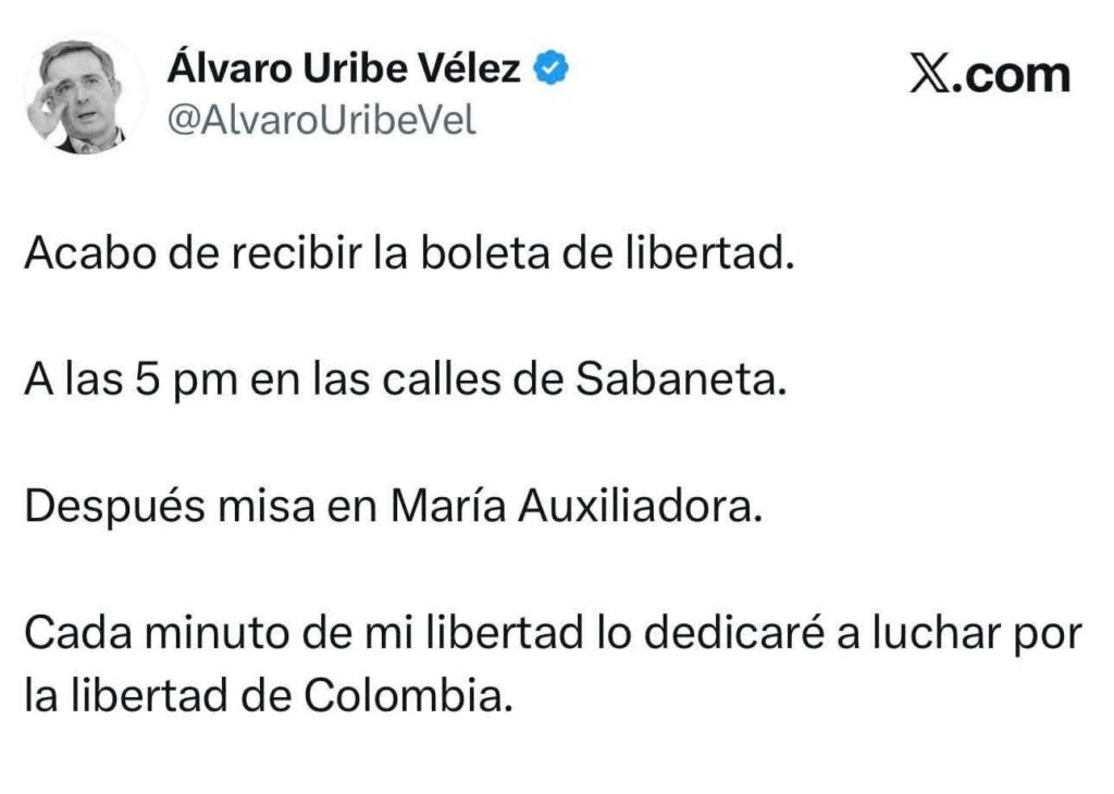 El exmandatario compartió el anuncio a través de un mensaje público en el que confirmó haber recibido la boleta de libertad. “A las 5:00 p. m. estaré en las calles de Sabaneta. Después, asistiré a misa en María Auxiliadora. Cada minuto de mi libertad lo dedicaré a luchar por la libertad de Colombia”, expresó.