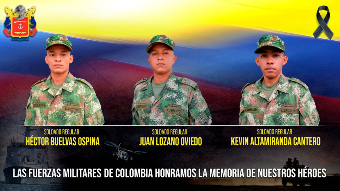 El mandatario de los monterianos identificó a los fallecidos como Juan Lozano, oriundo de Montería; Héctor Buelvas, de Pueblo Nuevo; y Kevin Altamiranda, del municipio de Lorica. Los tres tenían la jerarquía de soldado regular.