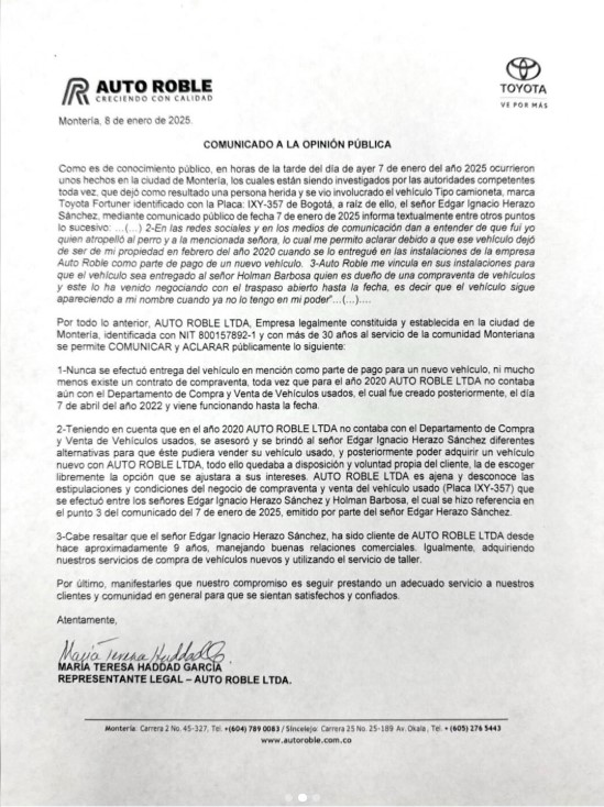 Por otro lado, la empresa dejó claro que no tiene conocimiento sobre las condiciones ni los detalles del negocio relacionado con el vehículo de placa IXY-357, involucrado en el incidente. Según versiones, este automóvil habría sido vendido entre Herazo Sánchez y un individuo identificado como Holman Barbosa, por lo que Auto Roble se considera ajeno a lo sucedido.