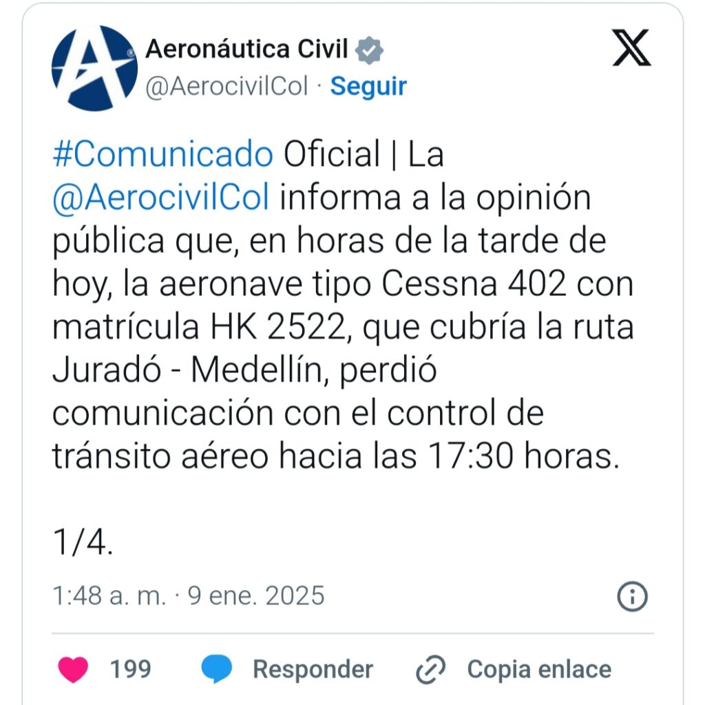 “De inmediato, se activaron los protocolos establecidos para la búsqueda y rescate (SAR) con el propósito de localizar la aeronave y salvaguardar la integridad de las personas a bordo”, señaló la Aeronáutica Civil en un comunicado de prensa.