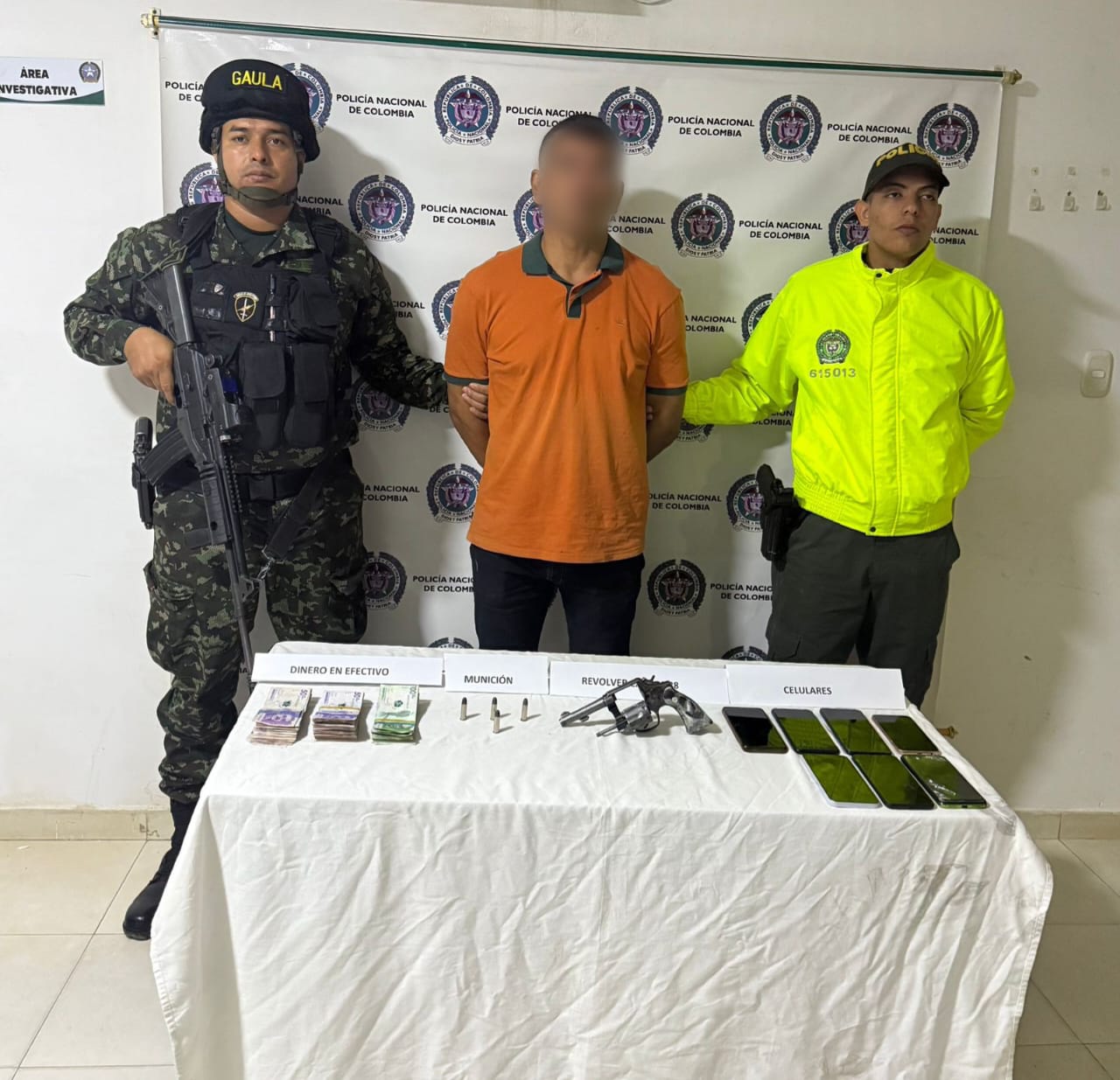 Durante el procedimiento, se logró la incautaron de un arma de fuego tipo revólver, marca Smith & Wesson, calibre 38 largo, cuatro cartuchos calibre 38, Dinero en efectivo por un total de $10.950.000 y 07 teléfonos celulares.