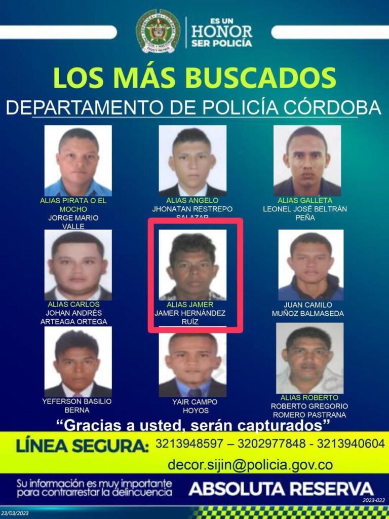 Alias “Jamer” se encontraría relacionado en el cartel de ‘Los más buscados’ de Córdoba, y sería el responsable del cobro de extorsiones a establecimientos de comercio como droguerías, ferreterías y almacenes de autopartes y moto partes. Se encargaba de realizaba disparos con arma de fuego, como método de presión a los que se negaban a pagar las exacciones.