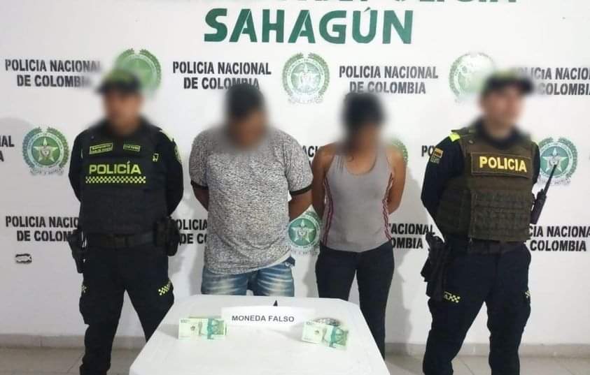 Sahagún, Córdoba. El Departamento de Policía Córdoba incrementa sus acciones para combatir el delito de moneda falsa, logrando sorprender en la vereda Bajo Grande de esta subregión de la sabana, a un hombre y una mujer con dos billetes de $100.000, los cuales presentaban seriales repetidos.