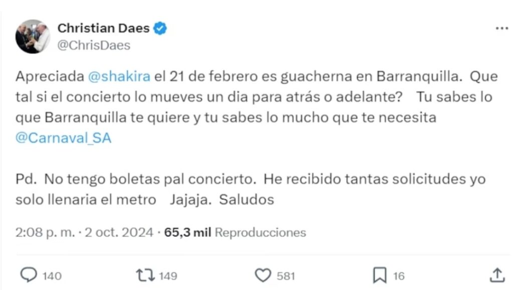 Mediante un respetuoso mensaje en su cuenta de X (antes Twitter), Daes le pidió a la artista barranquillera que mueva su espectáculo un día antes o después para evitar que el concierto afecte la participación en la Guacherna. “Querida Shakira, el 21 de febrero es nuestra querida Noche de Guacherna. Sería ideal que el concierto se mueva un día antes o después para no opacar este evento tan querido por los barranquilleros. ¡Te lo agradeceríamos de corazón!”, expresó Daes en el mensaje, etiquetando directamente a la cantante.