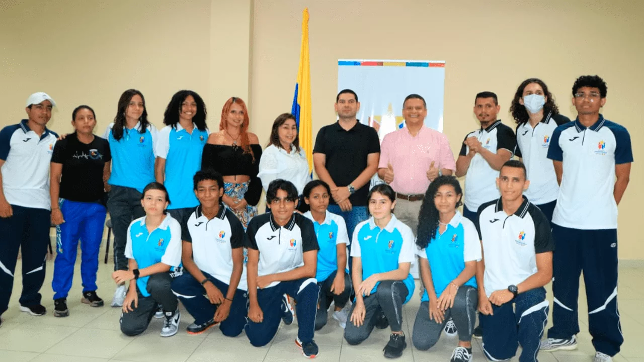 Los secretarios Germán Quintero, general; Julio Lora, de Planeación, y Lina Cordero, de Educación, le entregaron la bandera a Óscar Enamorado, miembro de la selección Colombia de Sóftbol y quien será el «padrino» del evento.