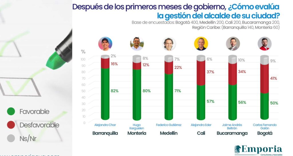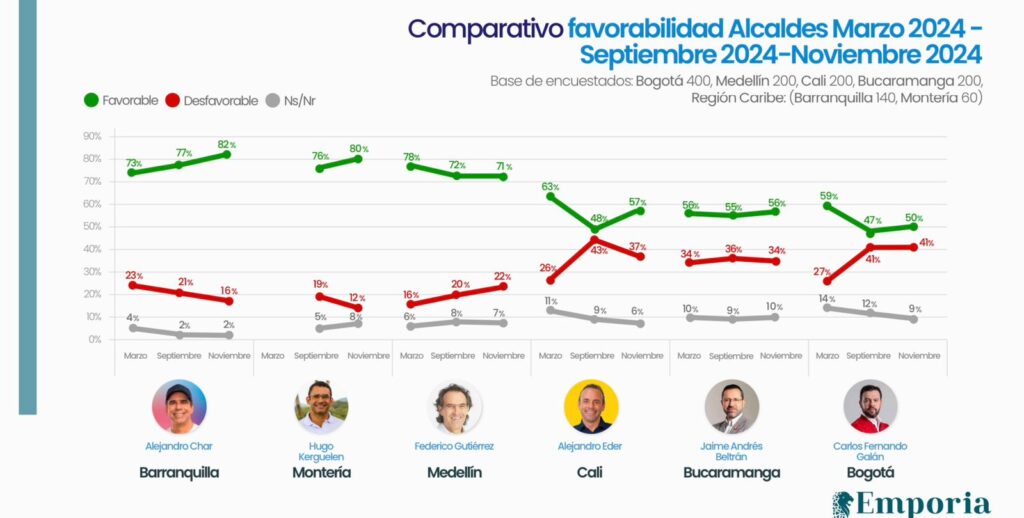Montería, 27 de noviembre de 2024. En la reciente encuesta realizada por la firma Emporia sobre el clima político en Colombia, se evaluó la favorabilidad de diversos alcaldes, revelando tendencias importantes en la percepción ciudadana.