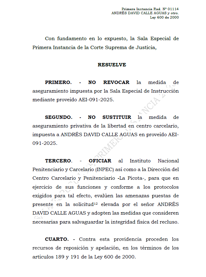 Por otro lado, el exrepresentante manifestó su preocupación por su integridad física, denunciando ser blanco de amenazas de muerte. Ante esta situación, solicitó su traslado a una guarnición militar. Frente a este requerimiento, la Corte Suprema de Justicia optó por no conceder el traslado inmediato, pero ordenó a la dirección general de la Cárcel La Picota y al Inpec realizar una evaluación técnica de seguridad para garantizar la vida del procesado dentro del sistema penitenciario. Con este panorama, Andrés Calle continuará su proceso judicial tras las rejas, mientras la justicia avanza en el esclarecimiento del desfalco a la gestión del riesgo.