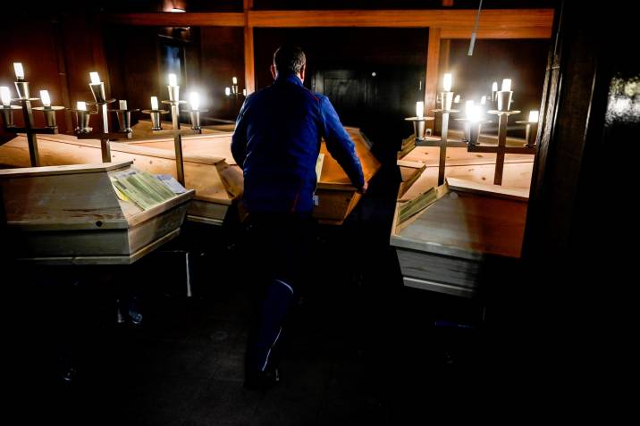 Los féretros se amontonan, debido al aumento de las muertes por o con COVID-19 en el crematorio de Meissen, al este de Alemania, una de las zonas más afectadas por la pandemia en el país.