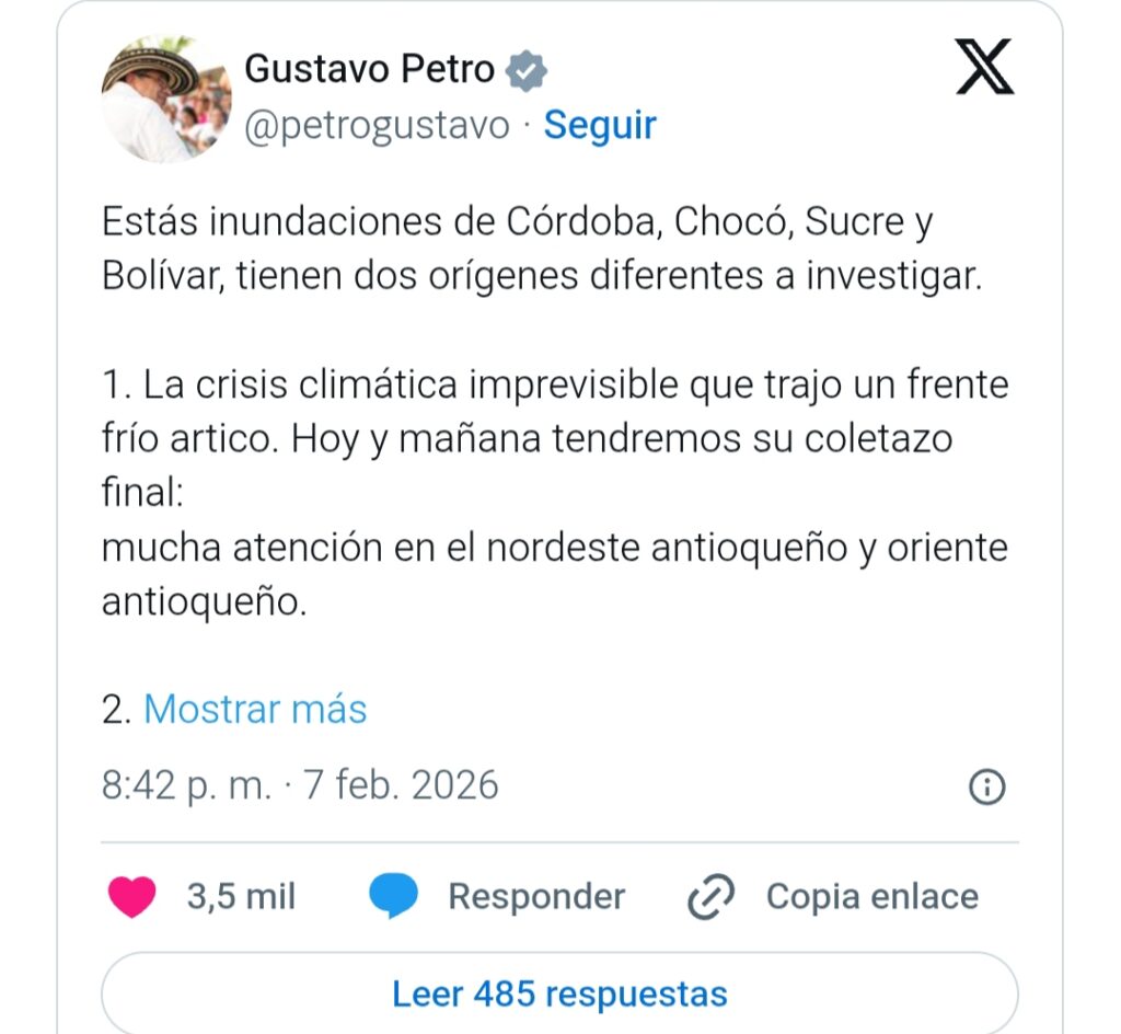 Mientras se desarrolla la controversia, el país enfrenta una de las emergencias más graves de los últimos años. De acuerdo con cifras oficiales entregadas por el propio Petro, ya se registran 14 personas muertas, 9.000 viviendas destruidas, cerca de 50.000 familias afectadas y más de 35.000 hectáreas inundadas. En total, unas 300.000 personas presentan algún tipo de afectación directa.