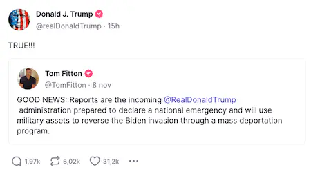 Trump confirmó sus planes este lunes en su red social Truth Social, en la que reaccionó con un “¡CIERTO!” a una publicación del activista conservador Tom Fitton, quien este mes había asegurado que la nueva Administración estaba planeando “declarar una emergencia nacional y usar activos militares” para llevar a cabo las deportaciones.