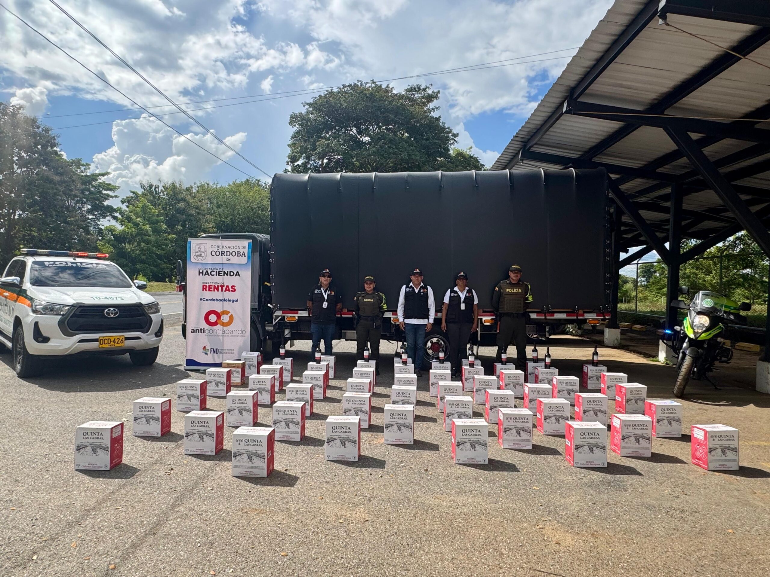 Montería, 20 de septiembre de 2025. En un nuevo operativo de verificación y control, el Grupo Anticontrabando de la Gobernación de Córdoba, junto a la Policía de Tránsito y Transporte, incautaron en la vía Montería – Planeta Rica, 2.430 botellas ilegales de vino importado, avaluadas en más de 60 millones de pesos.